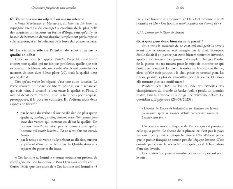 In conversation, living together means respecting others, making space for them, and expressing oneself. Talking involves maintaining a subtle balance between these three dimensions, here explored through 123 ways of speaking French, simply explained with examples.